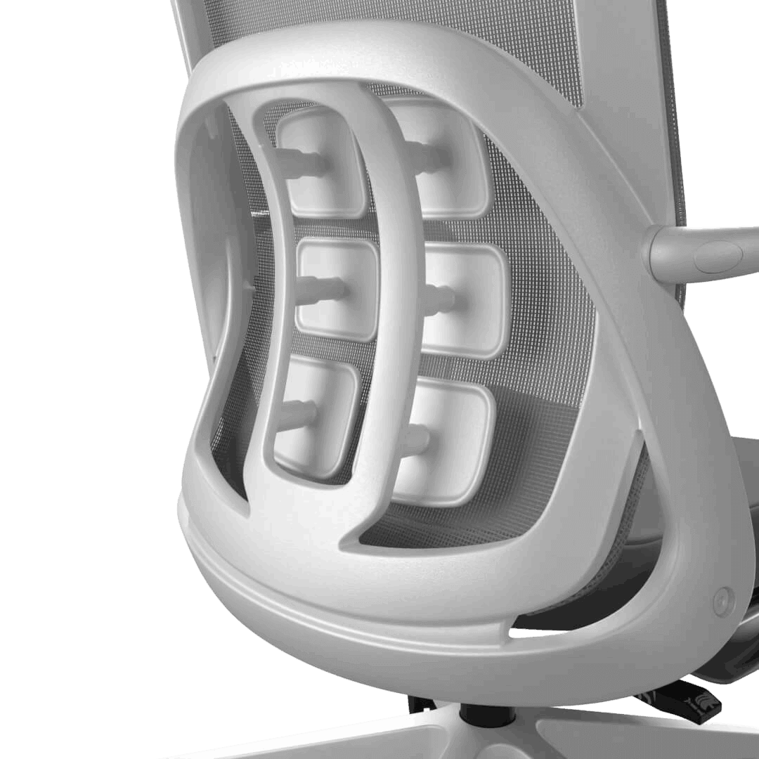 Operadlo stoličky je vybavené profilovými prvkami, ktoré poskytujú cielenú podporu v kľúčových oblastiach chrbta. Výsledkom je rovnomerné rozloženie tlaku a optimálna opora bedrovej a hornej časti chrbta, čo pomáha správnemu držaniu tela a znižuje únavu počas celodenného sedenia.