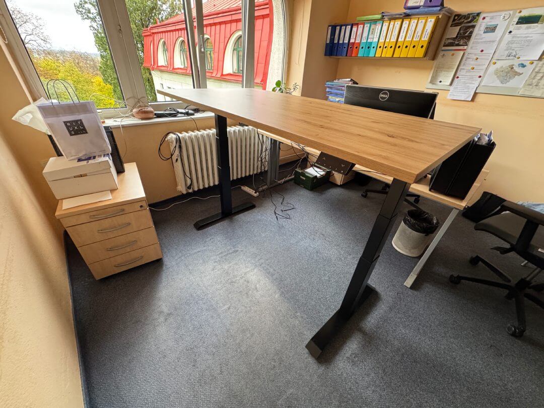 Sestavení stolu zabralo cca půl dne (zhruba 6-8 hodin) od vybalení přes sestavení nohou, vyřešení držáku kabelů, vycentrování nohou na desku s přesností na několik desetin milimetru (nechci mít stůl křivě), finálnímu připevnění všeho k desce pomocí akušroubováku až po ustavení, vyvážení stolu a vyzkoušení. Nakonec vše fungovalo na první pokus. Dokonce si stůl pamatuje nastavení všeho i při odpojení od elektřiny - pračky a myčky by se mohly inspirovat! :-)