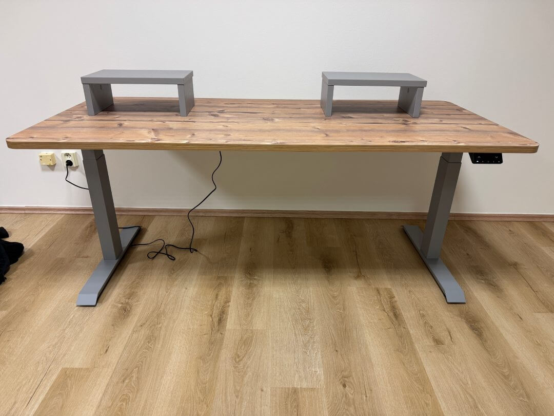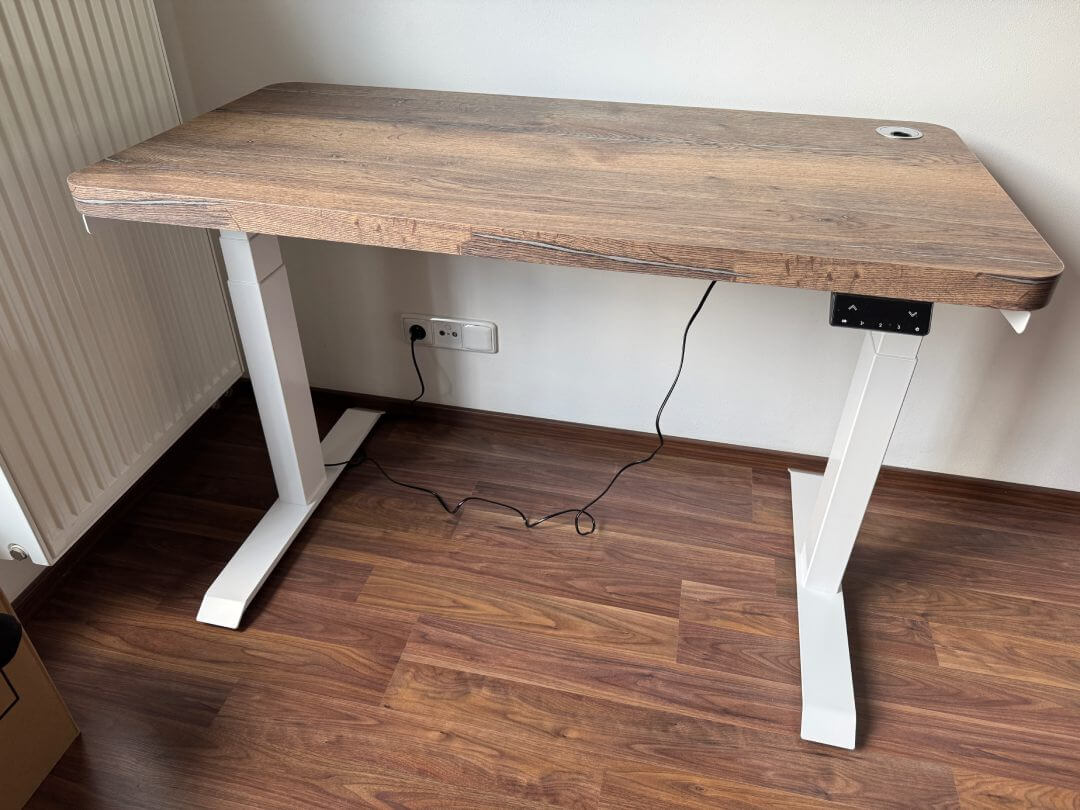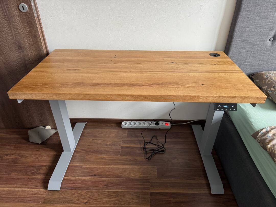 Sestavení stolu zabralo cca půl dne (zhruba 6-8 hodin) od vybalení přes sestavení nohou, vyřešení držáku kabelů, vycentrování nohou na desku s přesností na několik desetin milimetru (nechci mít stůl křivě), finálnímu připevnění všeho k desce pomocí akušroubováku až po ustavení, vyvážení stolu a vyzkoušení. Nakonec vše fungovalo na první pokus. Dokonce si stůl pamatuje nastavení všeho i při odpojení od elektřiny - pračky a myčky by se mohly inspirovat! :-)