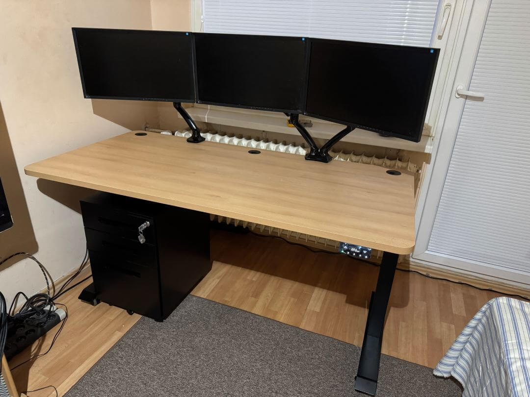 Sestavení stolu zabralo cca půl dne (zhruba 6-8 hodin) od vybalení přes sestavení nohou, vyřešení držáku kabelů, vycentrování nohou na desku s přesností na několik desetin milimetru (nechci mít stůl křivě), finálnímu připevnění všeho k desce pomocí akušroubováku až po ustavení, vyvážení stolu a vyzkoušení. Nakonec vše fungovalo na první pokus. Dokonce si stůl pamatuje nastavení všeho i při odpojení od elektřiny - pračky a myčky by se mohly inspirovat! :-)